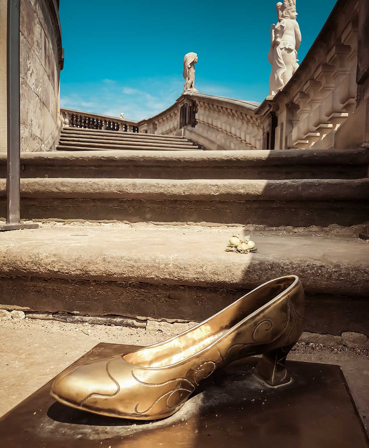 The photo at the bottom shows Cinderella’s shoe at the stairs where she lost hers when she tried to outrun the prince.